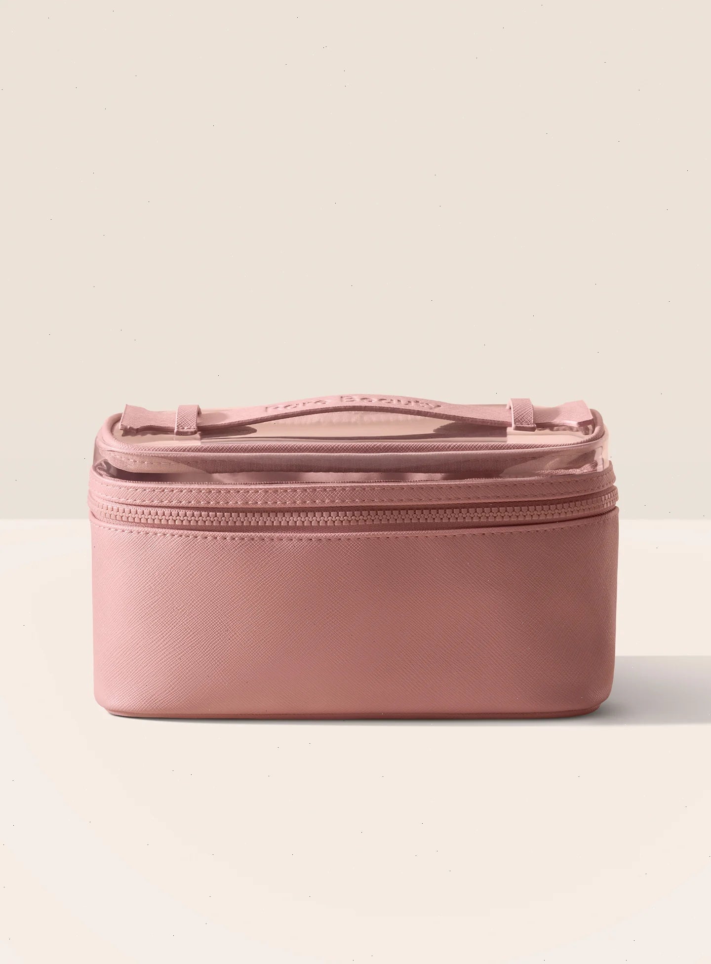 Made of vegan saffiano leather in our signature Find Comfort mauve, with a clear, zip-open top that lets you keep track of everything inside.