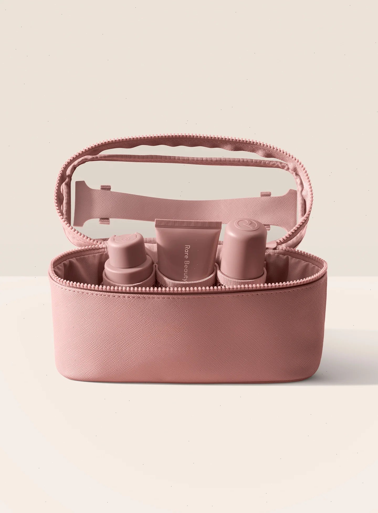 Easy-grab top handle with debossed Rare Beauty logo.
